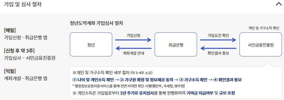 영업점 방문, 인터넷 스마트 뱅킹을 통해 신청하게 되면 신청 후 약 3주 뒤 서민금융진흥원에서 가입요건 및 가입가능여부를 확인하고 대상여부를 결정하게 됩니다. 그리고 익월초 청년도약계좌 개설을 진행하실 수 있습니다.